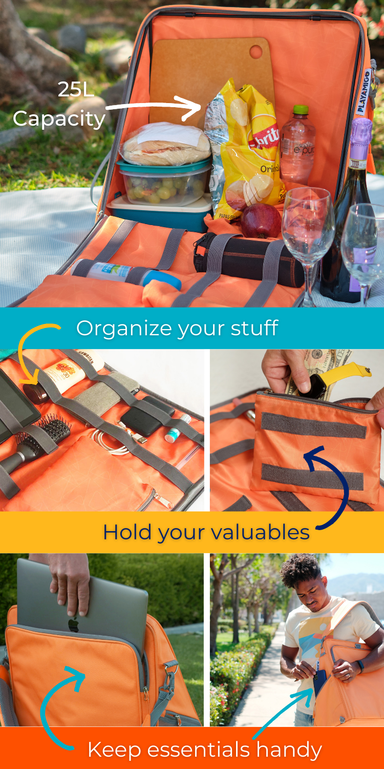 Playamigo can hold everything for your outing – picnic blanket, beach towel, beverage cooler, snacks, sunscreen, bug repellent, book, whatever you need! It also features: